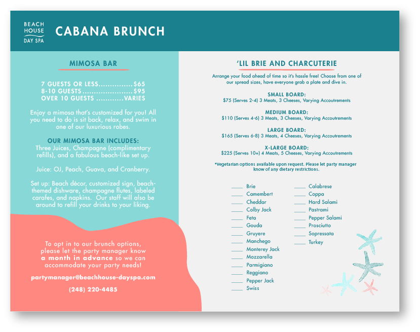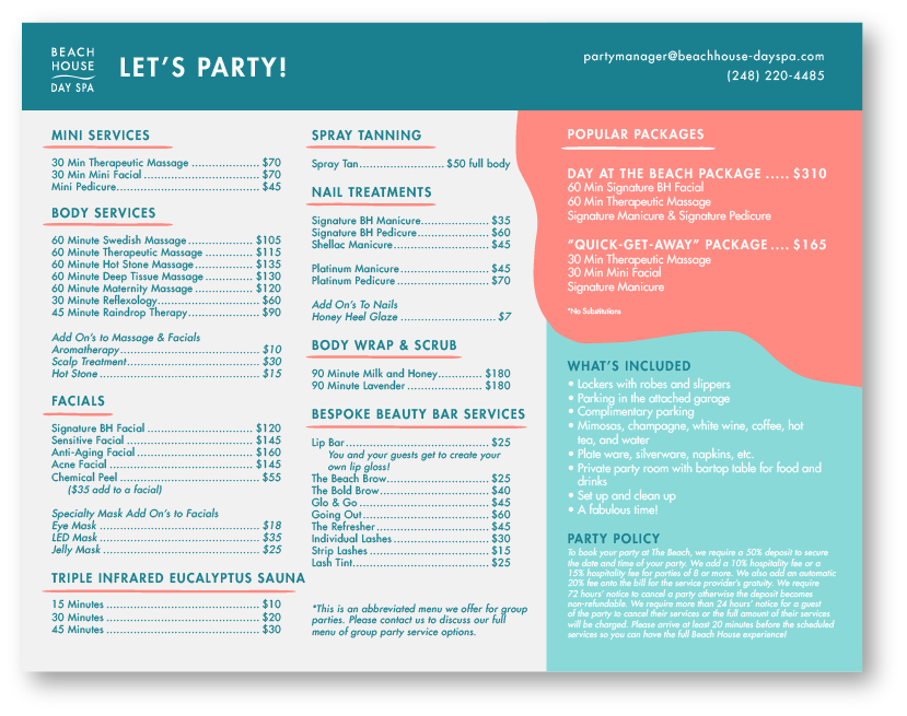 the midnight oil group provides graphic design support to Beach House Day spa, including in-spa signage, menu updates, social media graphics and promotional flyers. All designs are on-brand, but different enough to keep the look of each piece engaging.