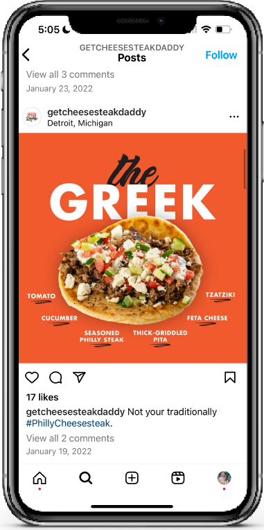 Working with existing logos and menus for each of the three launch brands – Bird in Hand,Cheesesteak Daddy and Pop’s Meatballs, the midnight oil group developed strategic brand guides that will be utilized as the brands move forward with marketing efforts. These guides included logo and style standards, brand voice and personality templates and correct examples of photography and creative use.