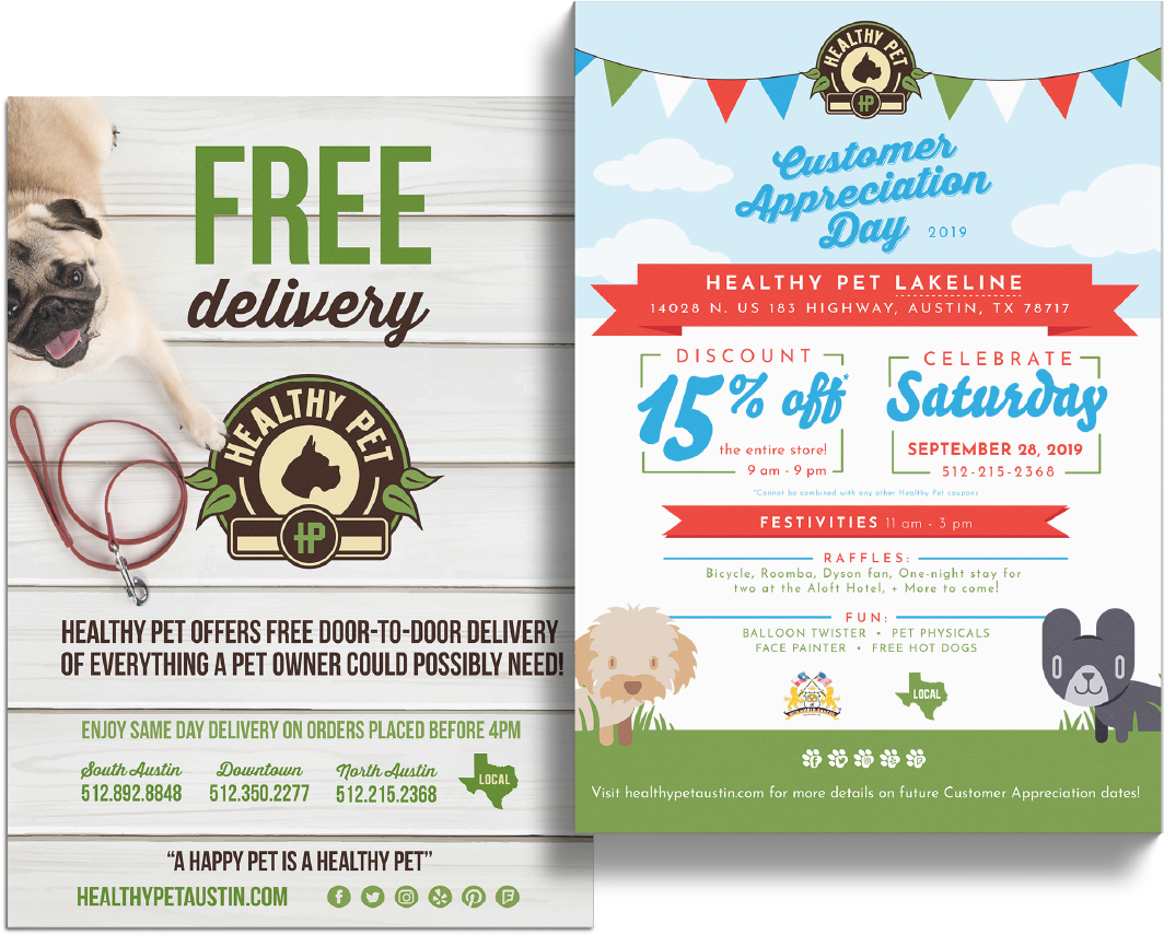 All of the Healthy Pet stores are extremely active in the local community, which includesattending, sponsoring or hosting pet-focused events. The midnight oil group develops marketing materials as needed for these events, including one-off flyers, posters or social media posts.Additionally, our team has developed in-store signage for POS, coolers and freezers.